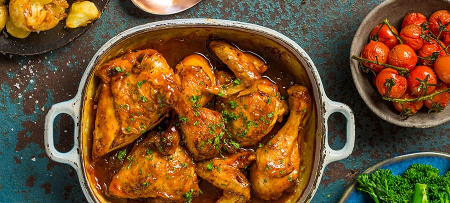 - Pour the sauce into an ovenproof casserole dish, add the chicken, skin side up, and bake until cooked through and sauce is thick and sticky.
