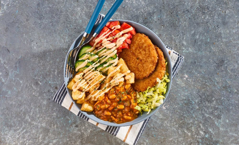 A hearty chicken bowl layered with spicy chakalaka. An idea of a burger in salad form.