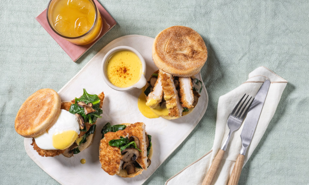 7. To assemble, lightly toast English muffins, add a tablespoon of mushrooms, followed by chicken schnitzel, egg and a drizzle of hollandaise.
