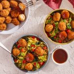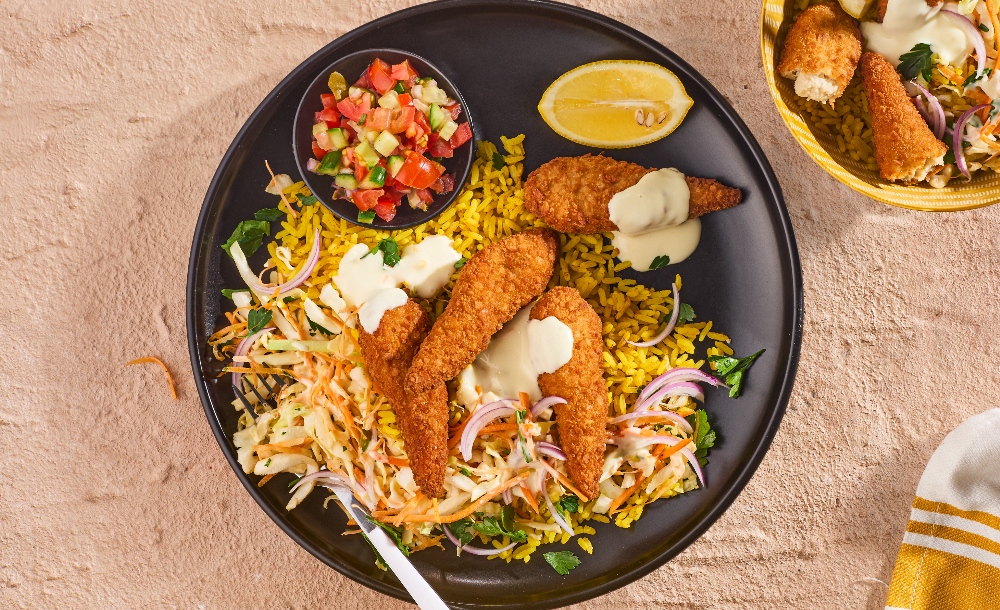 A balanced bowl with chicken strips, rice with a fresh slaw, wholesome and satisfying.