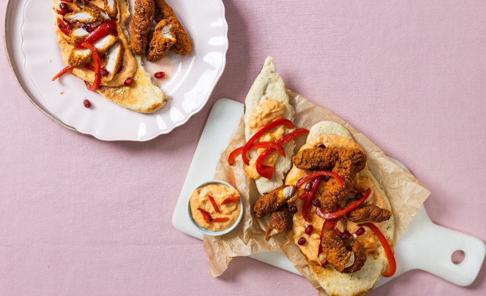 Chicken strips & red pepper hummus flatbread