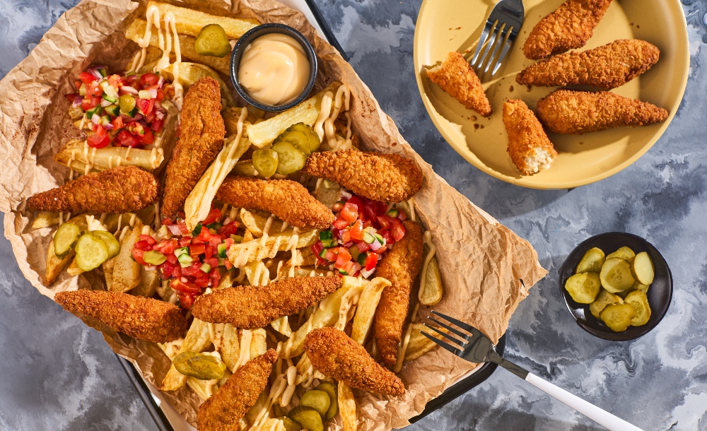 Crispy chicken strips with drenched and saucy slap chips, the ultimate weekend indulgence.