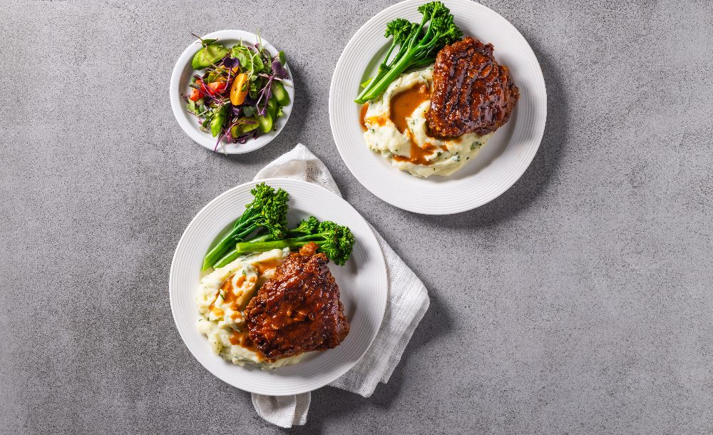 - Plate the Southern Style Crumbed Chicken thighs with herb mash and tender stem broccoli, pouring the gravy over. Serve with a side salad.