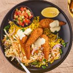 Crispy chicken rice bites, with avocado and pickled vegetables