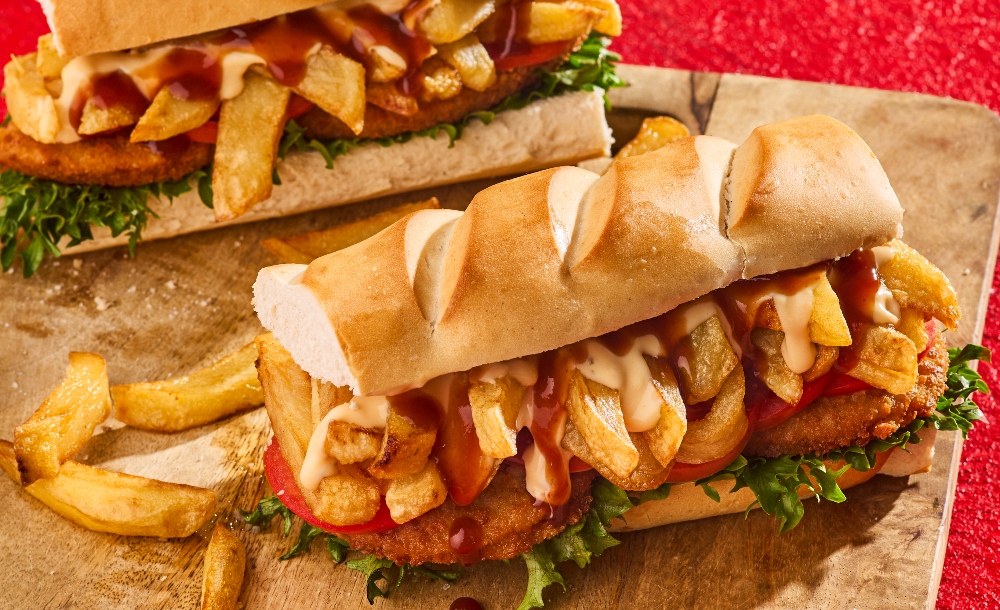 A loaded chicken burger style inspired by Cape Town’s famous Gatsby, stacked with slap chips and big flavours.