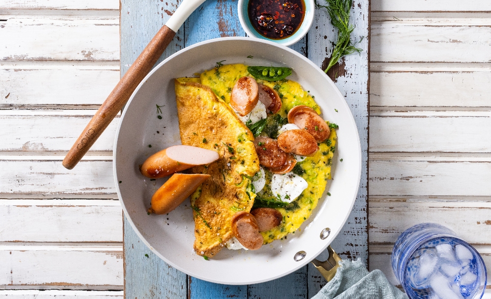 - Dot half the cheese on the omelette, followed by sugar snaps and then the cooked franks.