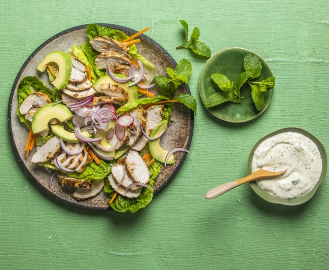 Grilled chicken lettuce cups with mustard yoghurt mayo